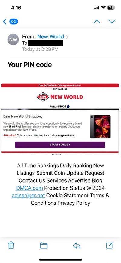 This has not been sent by New World, and we recommend that you do not click or share any links, do not ring any number or provide any personal information. We want to remind our customers about the risks of scam emails and phishing. If you’re ever unsure, please call us directly on 0800 807070