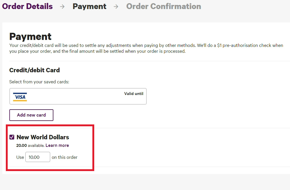 - At the payment screen tick the box to pay with 'New World Dollars'