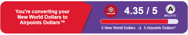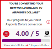 If you’ve chosen to convert your New World Dollars to Airpoints Dollars™, every 5 New World Dollars you earn will be automatically converted to 5 Airpoints Dollars. There are three places you can see your progress to your next 5 Airpoints Dollars conversion.1. New World Clubcard weekly email Your progress to your conversion will show at the top of your email header. If you’re not already on the list, you can opt in to receive it here.