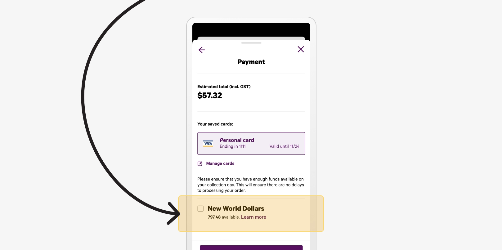- When you’re ready to pay, select ‘New World Dollars’ on the payment screen