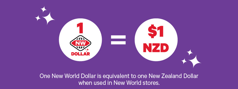 You can use New World Dollars as a form of payment instore or online at New World stores nationwide. 1 New World Dollar is equivalent in value to 1 New Zealand Dollar (NWD 1 = $1 NZD) when used in New World stores. For example, if you have a balance of 10 New World Dollars, you can spend these on $10 worth of qualifying* groceries at New World.