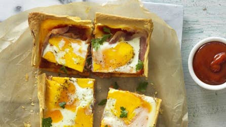 Our easy bacon and egg slice only has four ingredients (short pastry, tomato sauce, bacon and eggs) and is incredibly simple to make. Serve with a salad and sauce on the side for a well-balanced meal and season with lashings of salt and black pepper! This bacon and egg slice is equally delicious as a dinner meal too.