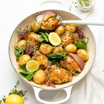 Nothing is better than a one pot (or one skillet) meal! This honey, chicken and fresh thyme tray is utterly delicious, with sweet red onions and melt in the mouth new potatoes coated in mustard speckled pan juices. Bake in the oven and your whole house will be smelling like the goodness of garlic, honey and lemon zest - just divine!