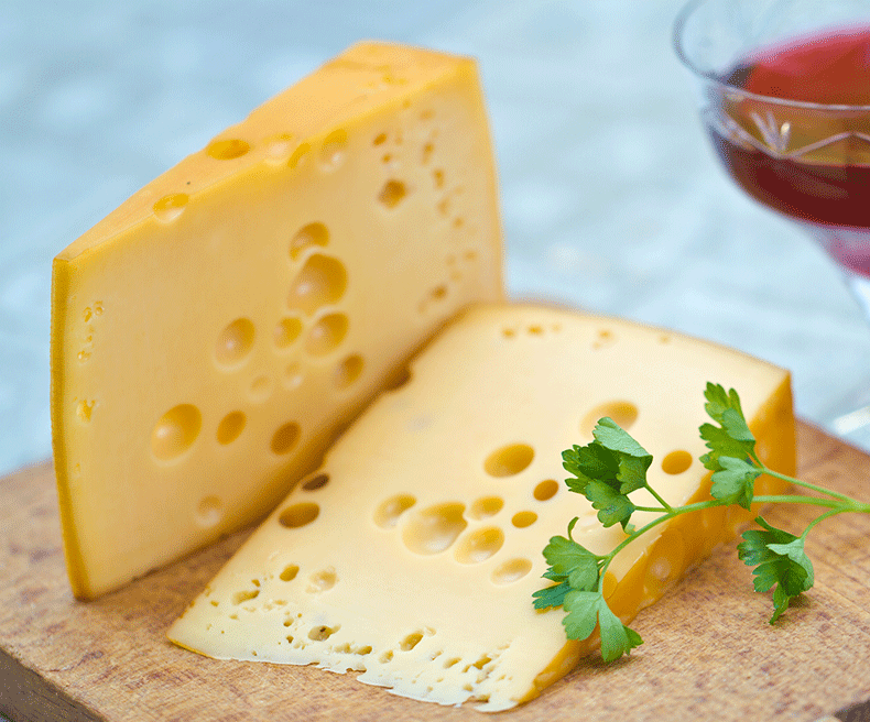 Emmental cheeseEmmental is probably the cheese you imagine when you picture ‘Swiss Cheese.’ Traditionally made in Switzerland, emmental is the pale yellow cheese with a hard rind that’s full of walnut sized holes. Considered one of the more complicated cheeses to make, emmental has a sweet aroma, with fruity flavours and a touch of acidity. These characteristics make emmental a delicious pairing with a robust red wine.