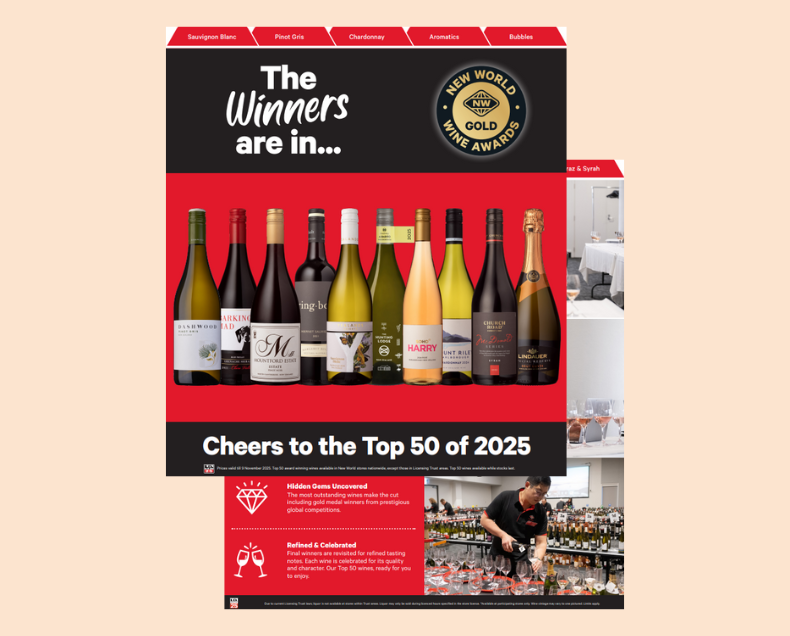 *New World Wine Awards Top 50 wines are priced at $30 or less until 9 November 2025. After this time the retail price may vary. Top 50 award winning wines are available in New World stores nationwide, except those in Licensing Trust areas. Top 50 wines are available while stocks last.