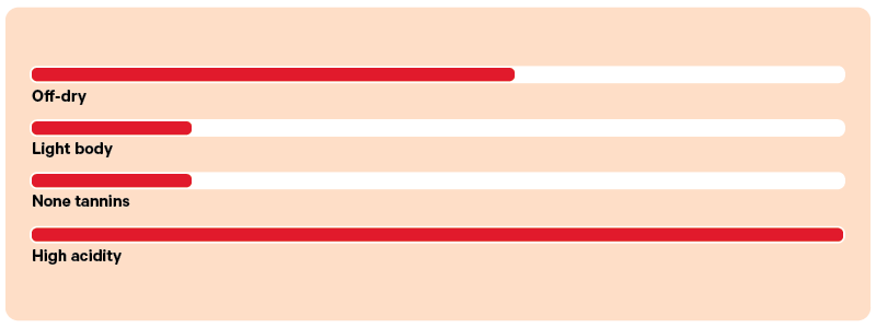 Riesling is light to medium-bodied, crisp and refreshing. Moscato is light-bodied, soft and sweet. Acidity: