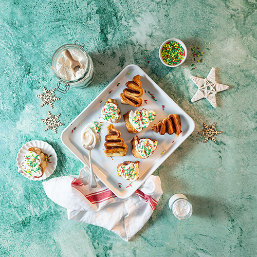 What’s the best way to ice and decorate the buns? You can swirl your icing over the buns with the back of a spoon—if the mixture is too thick, just add a little water to loosen. You can also put the icing in a zip lock back and snip the corner off to make a handmade piping bag, and pipe decorative lines and dots on your tree buns once baked. You can decorate the trees once iced with a light dust of cinnamon or add dried fruits and edible herbs (like dried cranberries and rosemary leaves) to represent the decorations on a Christmas tree.