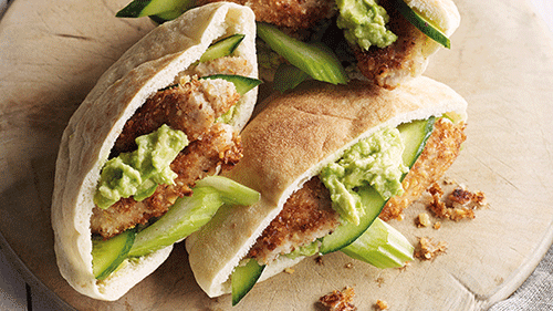 Cut each pita bread in half to create a pocket. Mash a 1/3 of the avocado and spread some inside each pita. Add the celery, cucumber and chicken. Serve with a spoonful of avocado on top.