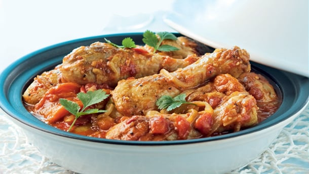The chicken can be cooked ahead of time in the slow cooker, ready with a welcoming aroma at the end of a busy day. Simply roast the pumpkin, steam the couscous and dinner is ready.