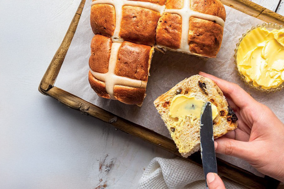 Celebrate Easter with these classic hot cross buns. Cinnamon spiced with pops of raisins, finished with a cross on the top, make these fluffy buns special and oh-so-delicious. The heavenly aroma will permeate your home and have everyone gathering round for a taste.
