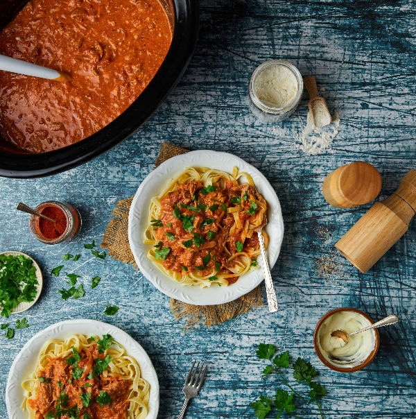 Tender shredded slow cooker paprikash-inspired pork is a crowd-pleasing meal complete with a creamy tomato and paprika sauce. Serve over fettuccine for a rich and satisfying weekend meal.