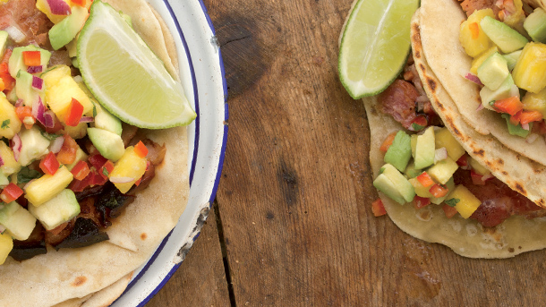 To assemble: Pile warmed leftover ham on warm tortillas. Add a good spoonful of salsa to each.