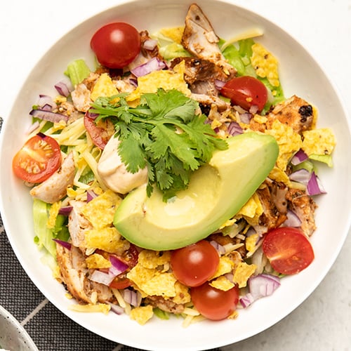 In a bowl arrange lettuce, red onion, cherry tomatoes, grated cheese, chopped chicken, sliced avocado and crushed corn chips.