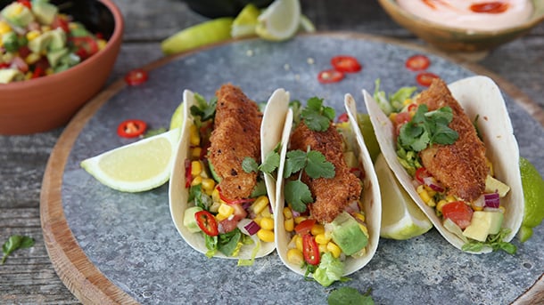 To dial up the spice on this recipe, you can add more chilli sauce or increase the cayenne pepper in the fish crumb. To omit the spice completely, leave these ingredients out along with the red chilli in the salsa.