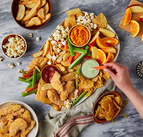 Cuddle up with blankets, put on your favourite movie and enjoy this movie night platter for a fun winter night in. The whole family can enjoy this assortment of finger food. From the crispy crumbed chicken tenders to the baked wedges, vegetables sticks, popcorn, corn chips and an assortment of dips or sauces, you’re all set for an incredible evening.