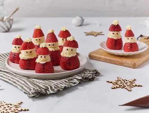 The ultimate kid-friendly Christmas snack, these strawberry santas are the fun festive treat you’ve been searching for. Dark chocolate eyes and buttons, whipped cream cheese beards, banana faces and strawberry hats are what make these santas sing.