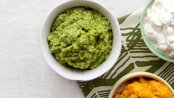 Tip: Use ½ cup soft mashed feta cheese mixed with ½ cup sour cream as the base for the dip.