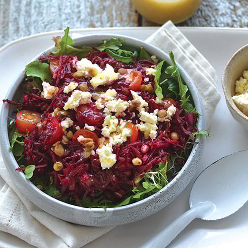 Raw beetroot, feta and lentil salad