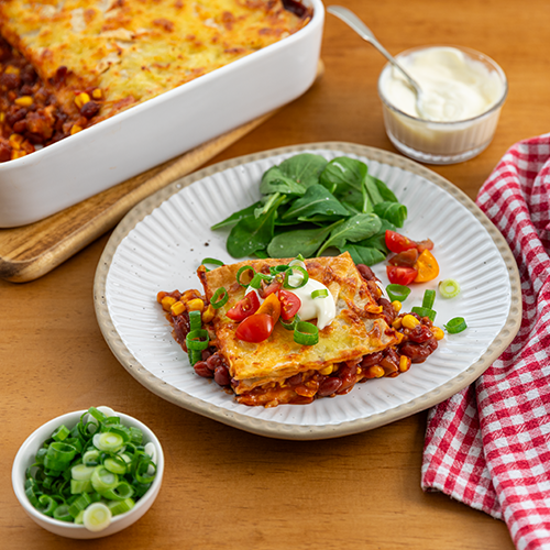 Combining the best of enchiladas with a hearty lasagne, this vegetarian bake is quick and easy to make and one for the whole family.