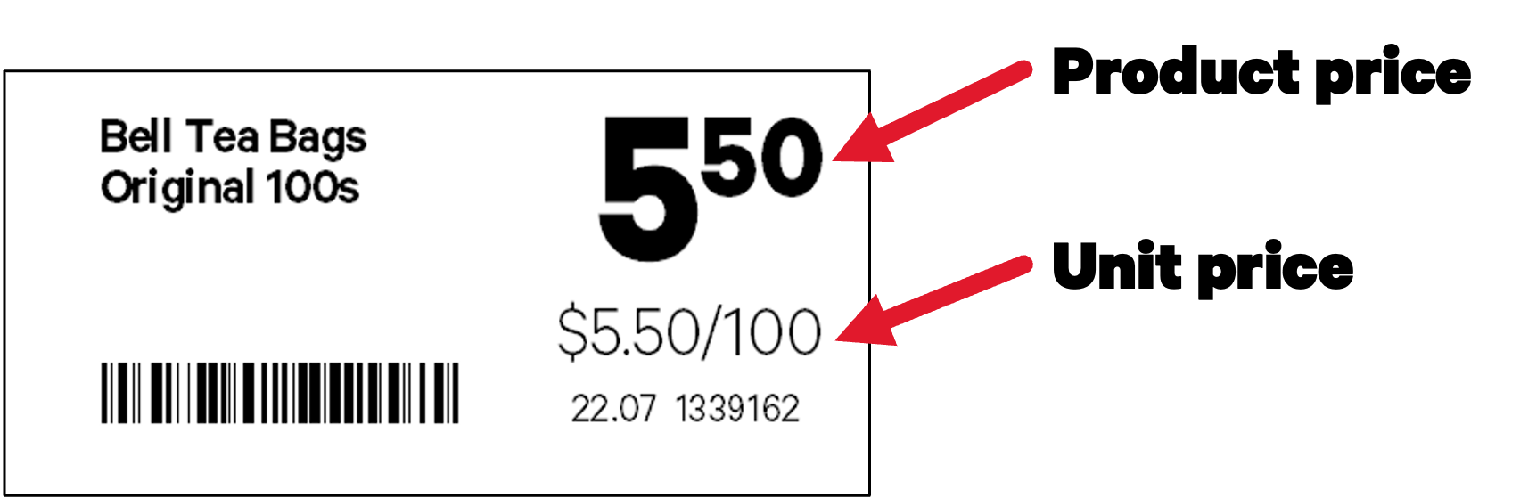 In the example above you can see that the advertised purchase price for Bell Tea Bags Original is $5.50, the unit of measure is per 100 items, so the Unit Price is displayed as $5.50 per 100 items.